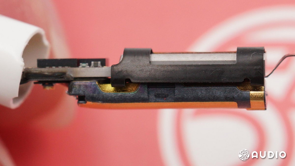 讓我們再把視線轉(zhuǎn)回AirPods Pro 2,上圖為對應耳機凹槽位置的排線與下方藍牙天線形成的壓力及結(jié)構(gòu)感應展示,體現(xiàn)出耳機仍然通過雙指捏合耳機柄端區(qū)域完成交互操作。