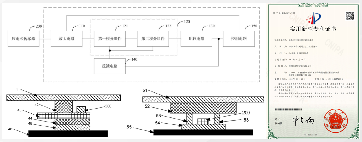 銳盟半導體的壓電感知方案集合了對于壓電微弱信號的采集,包括對相關參數(shù)的自動學習和補償、溫濕度環(huán)境自適應、自適應濾波和智能處理算法等核心技術,在電路結(jié)構(gòu)應用方面做了一定的專利保護。